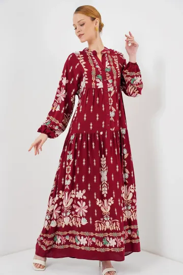 2423 Otantik Desenli Tesettür Elbise - H. Bordo