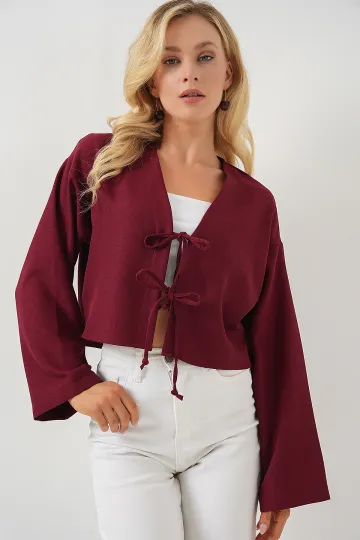 Önü Bağlamalı Keten Kimono 960 - Bordo