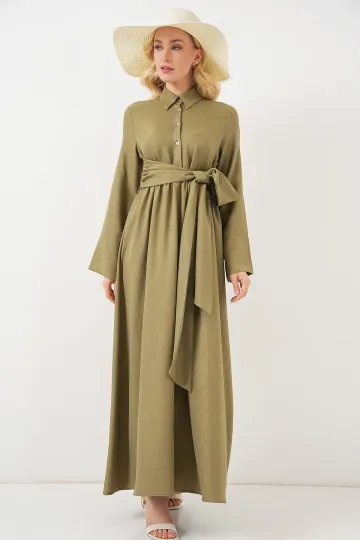 Kadın Önü Bağlamalı Keten Elbise 2574 - Çağla