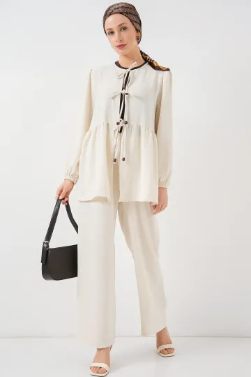 Kadın Önü Bağcıklı Tunik Pantolon İkili Takım 6744 - Ekru