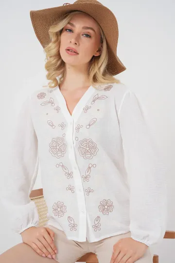 Kadın Nakışlı Uzun Kol Bluz 963 - Kahverengi