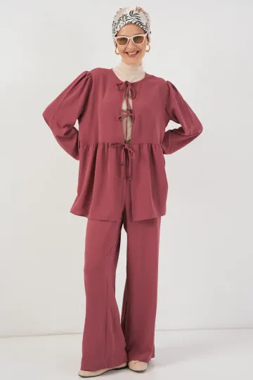 Kadın Önü Bağcıklı Tunik Pantolon İkili Takım 6744 - Gül Kurusu