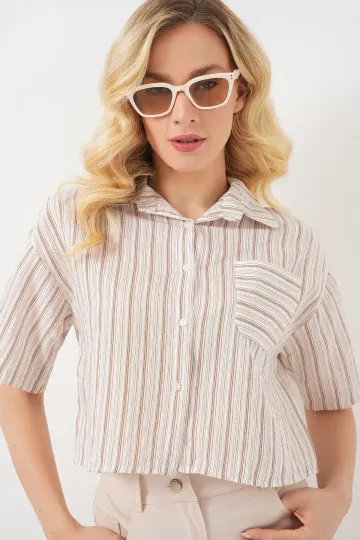 Kadın Çizgili Crop Gömlek 20342 - Bej