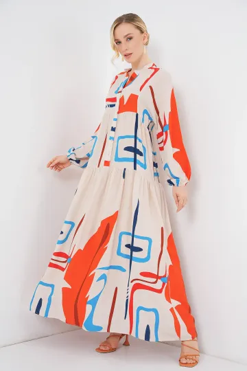 Kadın Desenli Uzun Tesettür Elbise 2585 - Turuncu