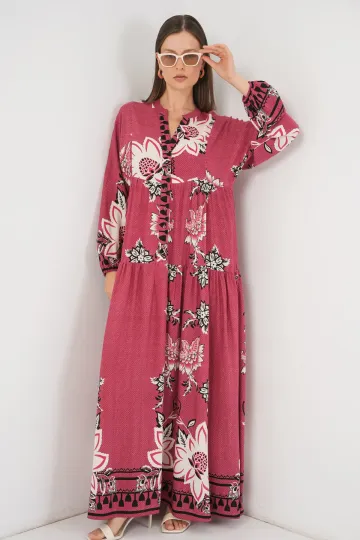 Kadın Desenli Uzun Tesettür Elbise 2585 - Gül Kurusu