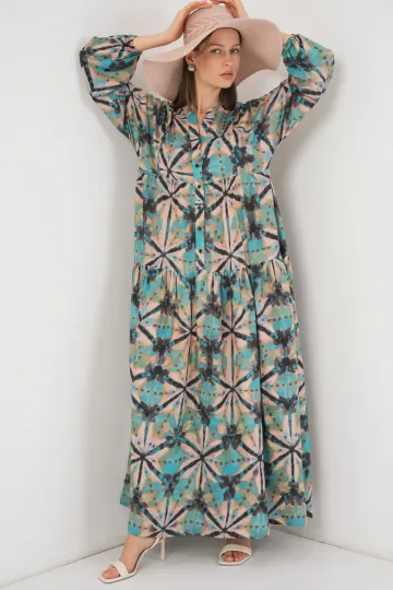 Kadın Desenli Uzun Tesettür Elbise 2585 - D. Mint