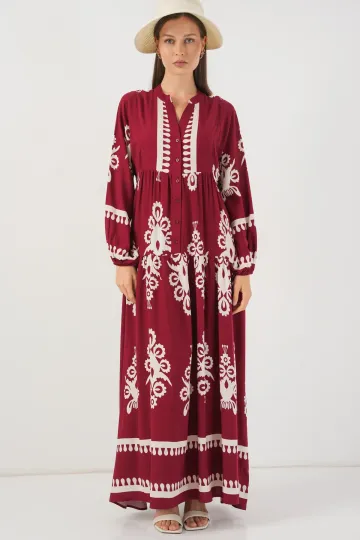 Kadın Desenli Uzun Tesettür Elbise 2585 - A.Bordo