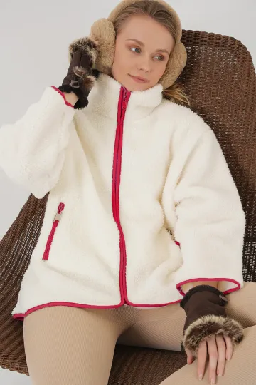 5211 Fermuarlı Peluş Mont - Kırmızı