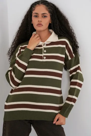 Kadın Çizgili Polo Yaka Triko Kazak 15952 - Haki