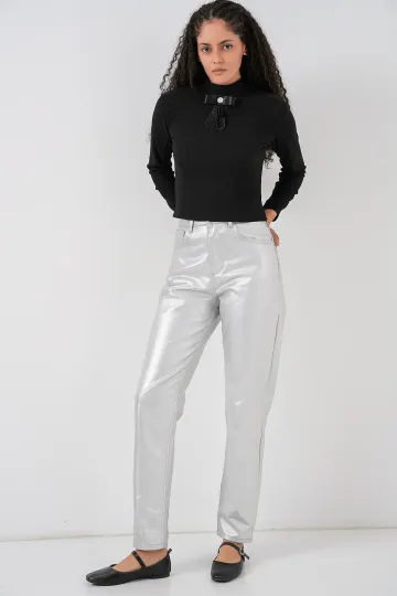 Kadın Yüksek Bel Parlak Pantolon 6738 - Gümüş