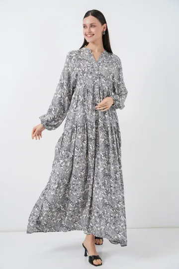 Kadın Desenli Uzun Tesettür Elbise 2585 - Gri