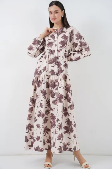 Kadın Lilyum Kumaş Uzun Tesettür Elbise 2593 - Kahverengi