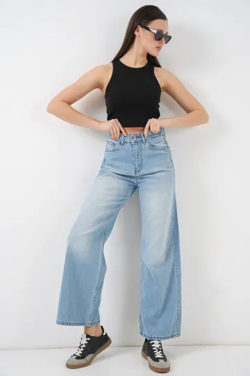 Kadın Bol Paça Yüksek Bel Palazzo Kot Pantolon 6656 - Açık Mavi