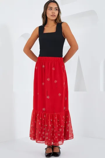 Kadın Kırmızı Desenli Şifon Etek 8010