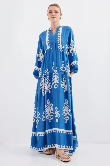 2423 Otantik Desenli Tesettür Elbise - Beyaz - İndigo