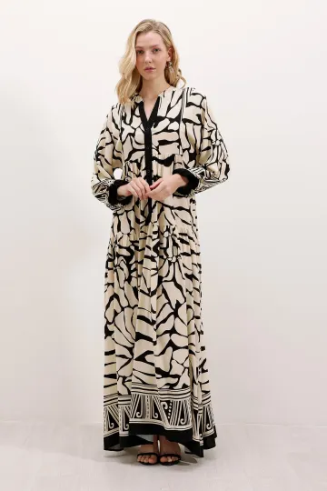 2423 Otantik Desenli Tesettür Elbise - C.Siyah