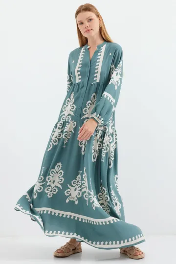 2423 Otantik Desenli Tesettür Elbise - F.Mint