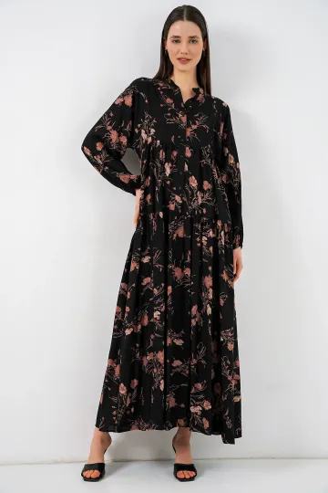Kadın Desenli Uzun Tesettür Elbise 2585 - B. Siyah