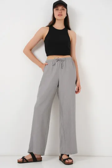 Kadın Geniş Paça Keten Pantolon 6735 - Gri