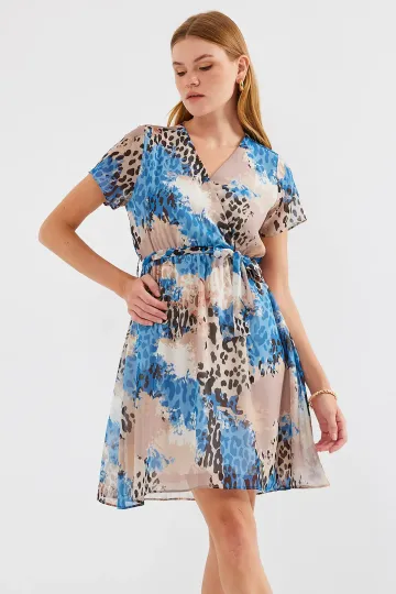 2502 Kısa Kol Desenli Şifon Elbise - Mavi