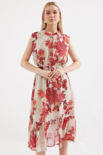 2503 Desenli Sıfır Kol Şifon Elbise - Nar