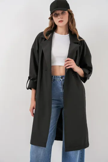 9104 Kruvaze Yaka Astarlı Trençkot - Siyah