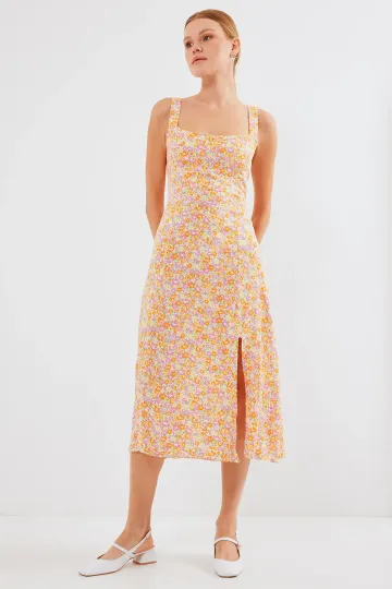 2282 Yırtmaçlı Askılı Viskon Elbise - Turuncu
