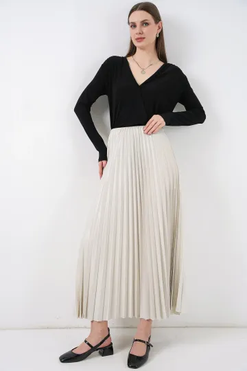 8009 Deri Görünümlü Piliseli Etek - Krem