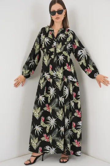 Kadın Desenli Uzun Tesettür Elbise 2585 - K. Siyah