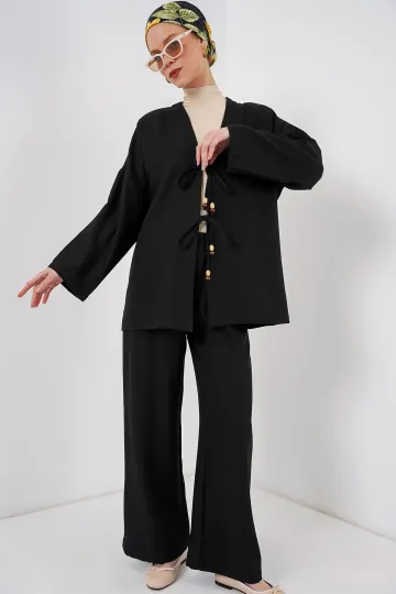 Kadın Keten Kimono İkili Takım 6727 - Siyah