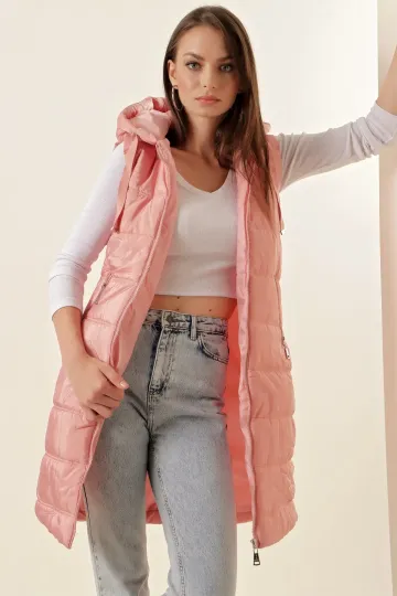 5140 Kapşonlu Uzun Şişme Yelek - Pembe