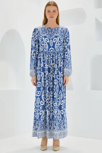 Kadın İndigo Ekru Desenli Uzun Viskon Elbise 1947