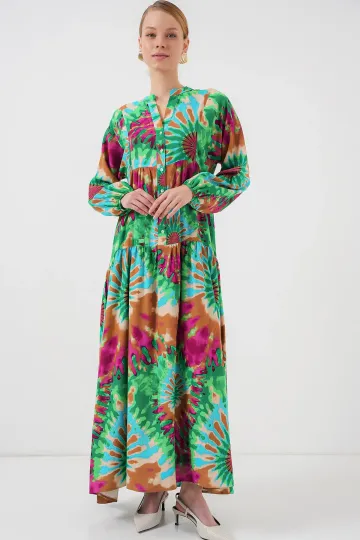 2423 Otantik Desenli Tesettür Elbise - Yeşil 9