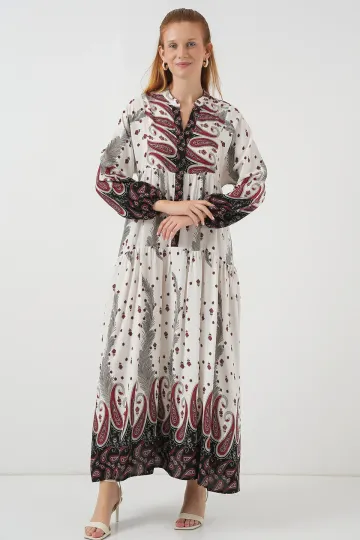 Kadın Desenli Uzun Tesettür Elbise 2585 - A.Kırmızı