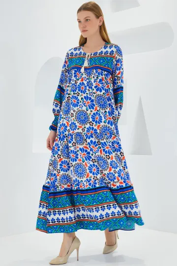 Kadın Saks Mavi Desenli Uzun Viskon Elbise 1947