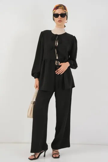 Kadın Önü Bağcıklı Tunik Pantolon İkili Takım 6744 - Siyah