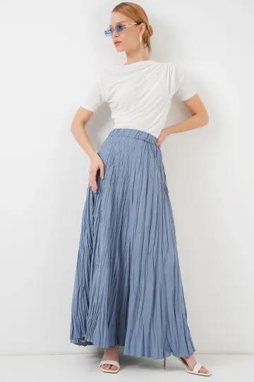Kadın Uzun Kırışık Etek 8042 - İndigo