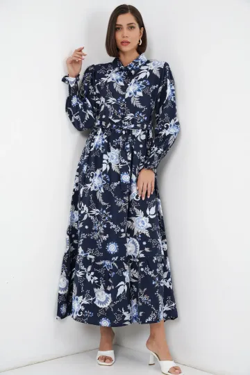 Kadın Kuşaklı Tesettür Elbise 2589 - Lacivert