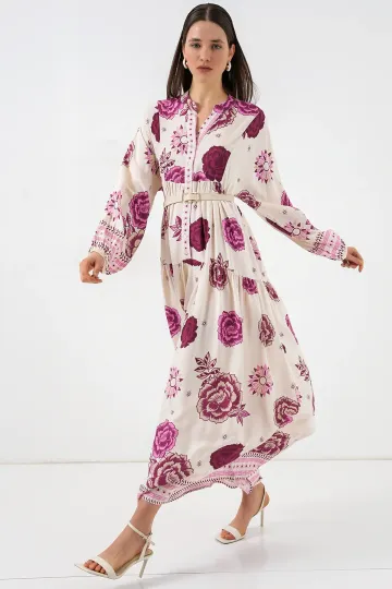 Kadın Desenli Uzun Tesettür Elbise 2585 - D. Fuşya