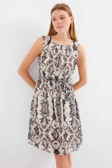 2501 Desenli Sıfır Kol Şifon Elbise - Siyah