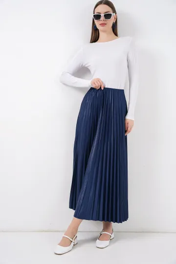 8009 Deri Görünümlü Piliseli Etek - Lacivert
