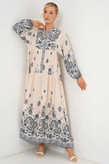 2423 Otantik Desenli Tesettür Elbise - Lacivert 12