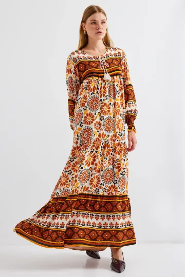 1947 Desenli Uzun Elbise - T. Kahverengi