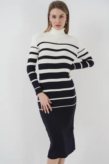 15841 Boğazlı Lacivert Beyaz Triko Elbise
