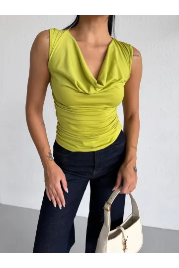 Kadın Fıstık Degaje Yaka Yanlardan Drapeli Sandy Bluz HZL25S-FRY123131
