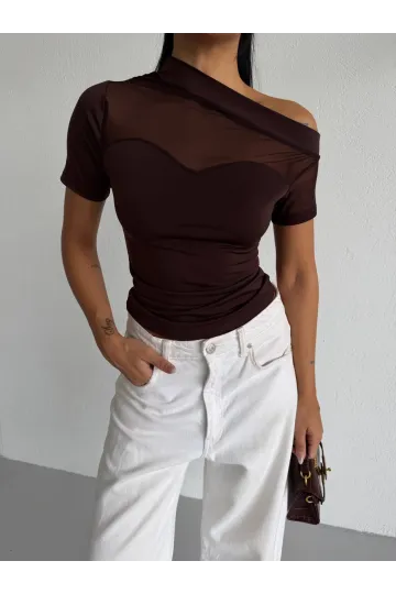 Kadın Kahverengi Tek Omuz Transparan Tül Detaylı Şık Sandy Bluz HZL26S-FRY123871