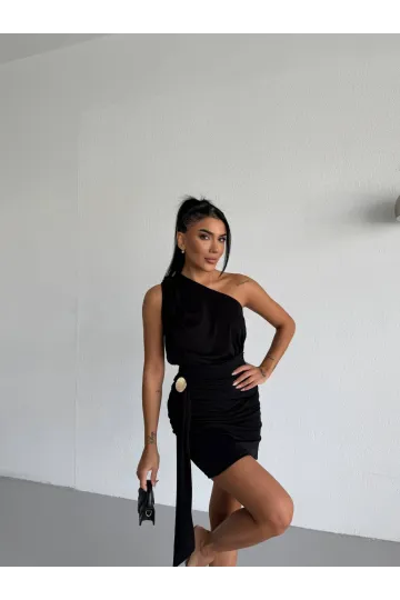 Kadın Siyah Tek Omuz Toka Detaylı Drapeli Sandy Kumaş Mini Elbise HZL26S-FRY123881