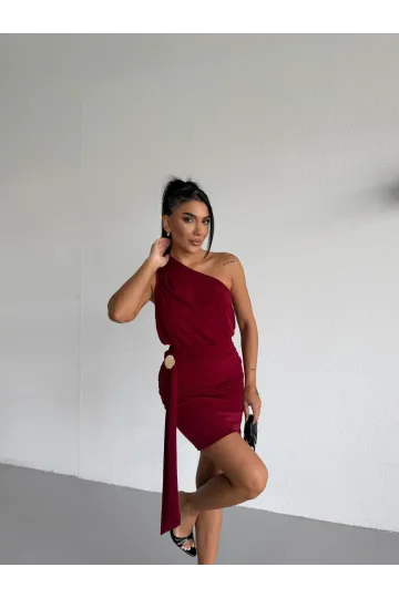 Kadın Bordo Tek Omuz Toka Detaylı Drapeli Sandy Kumaş Mini Elbise HZL26S-FRY123881