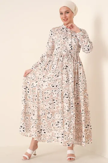 2144 Hakim Yaka Tesettür Elbise - Krem