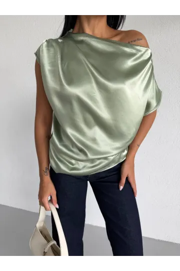 Kadın Çağla Yeşili Tek Omuz Asimetrik Kesim Saten Bluz HZL26W-FRY121171